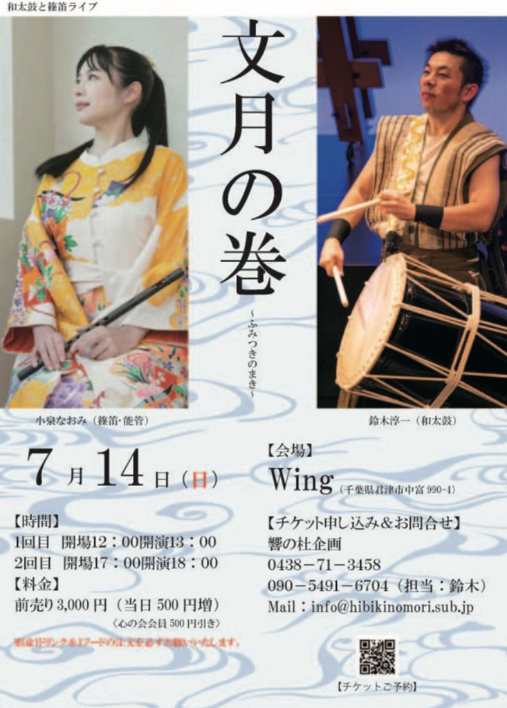 和太鼓奏者の鈴木淳一さんと篠笛・能管奏者の小泉なおみさんによる、夢のコラボレーションライブが7月14日(日)、君津のWingで開催決定!🎉 和太鼓と篠笛の共演『文月の巻』詳細はこちら! 今回のライブタイトルは『文月の巻』。昼と夜の2回公演で、お昼... -